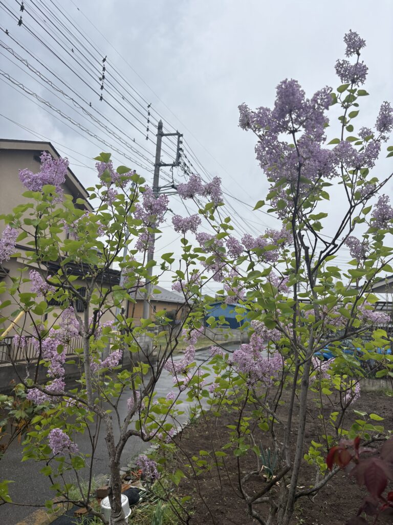 薄紫色のお花を咲かすライラック、トリさんが見つめる紫色のお花はミツバツツジになります。どちらもサクラが開花する4月に同時開花します。